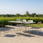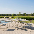 The Parco Dining Table features an elegant steel frame with a resilient powder-coated finish, designed for enduring use. Its sleek, contemporary shape integrates smoothly into diverse outdoor environments, from intimate courtyards to spacious family backyards.