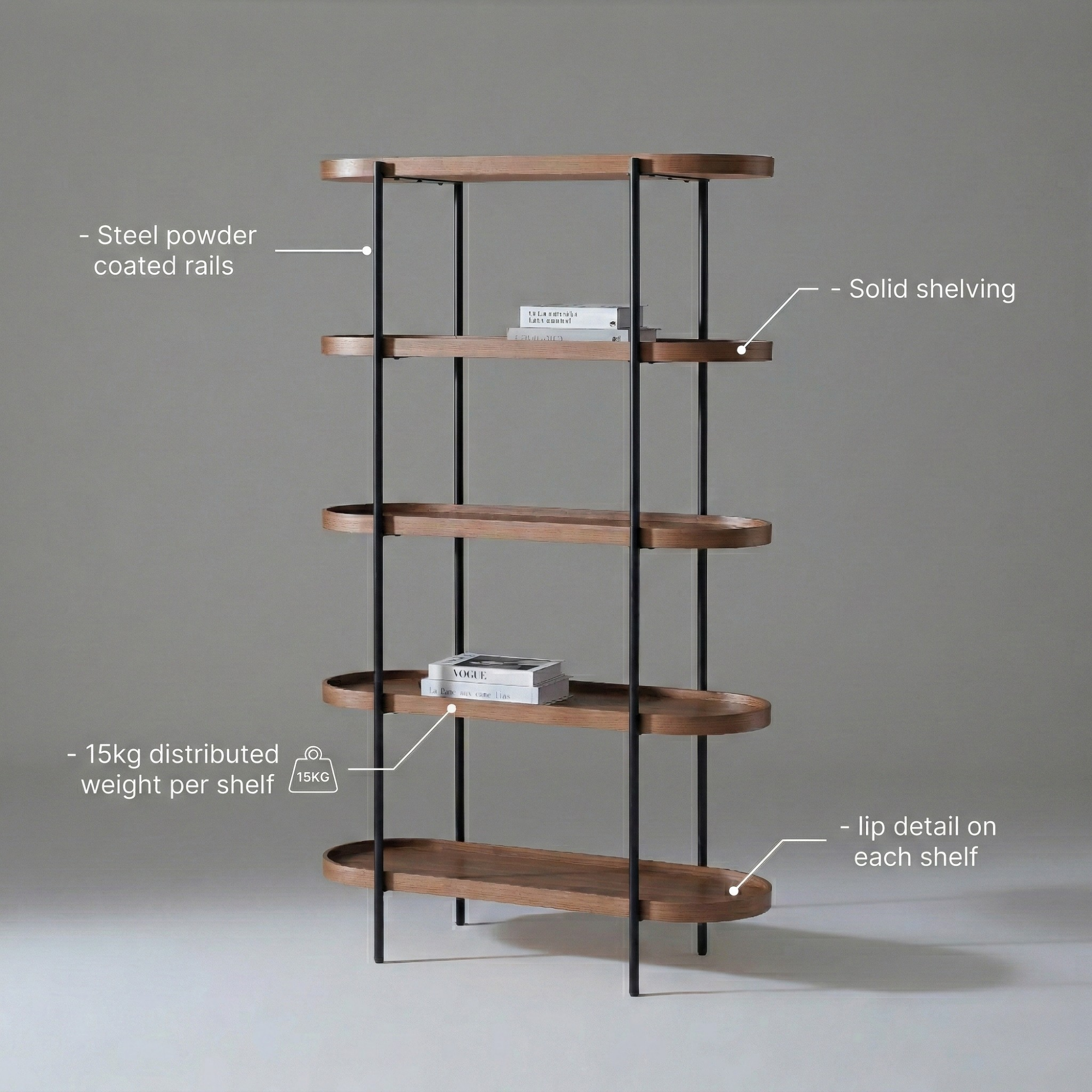 Vertical Storage Mastery: Five generous tiers maximise floor space, providing significant room for extensive book collections, trailing plants, and sculptural decor.