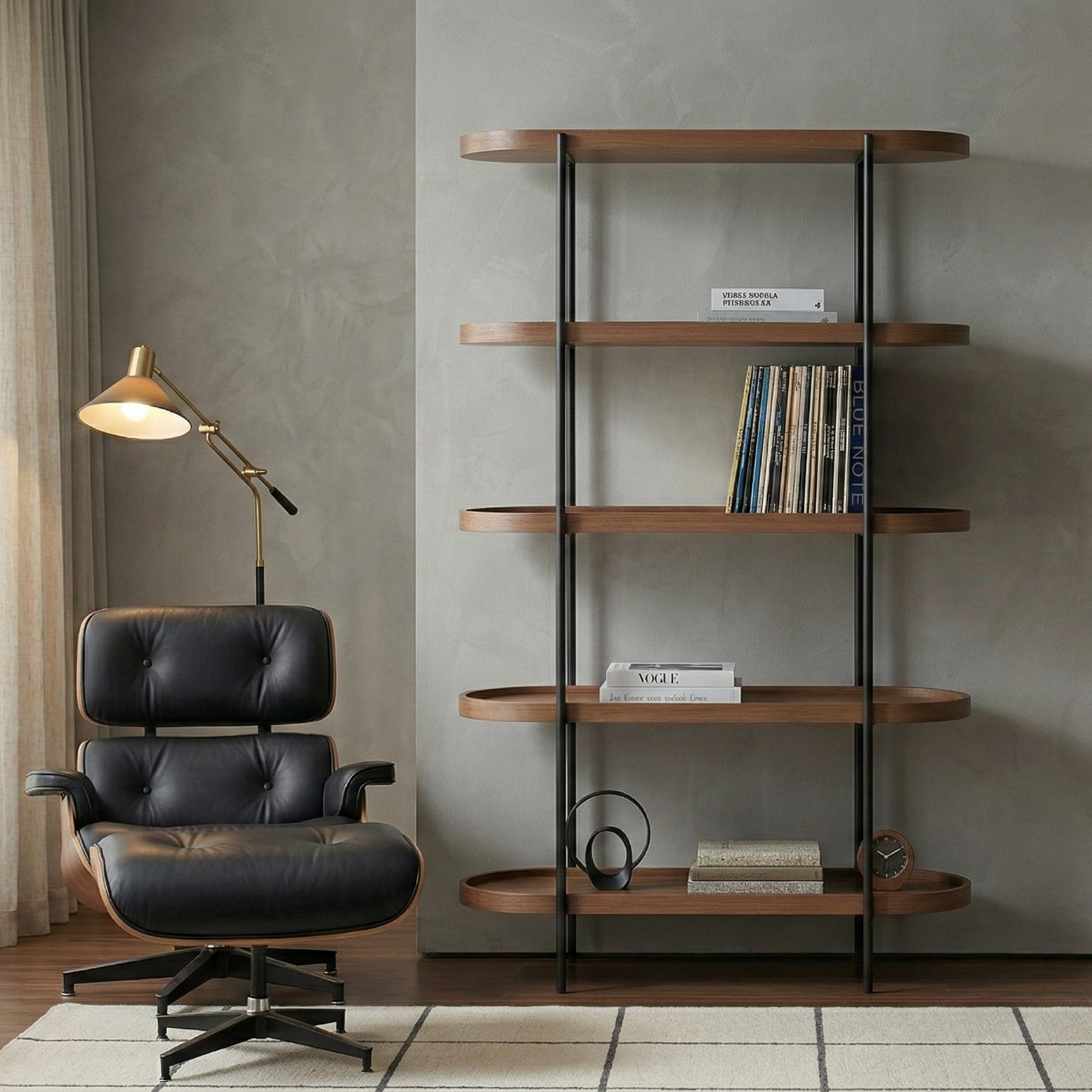 Command attention in your home office or living area with the Cleo Walnut & Black 5-Tier Tall Bookshelf. This commanding unit merges the deep, chocolate tones of walnut timber with the solid definition of a matte black metal frame. It perfectly captures the "Moody Modern" aesthetic, offering a storage solution that is rich in texture and architecturally confident.