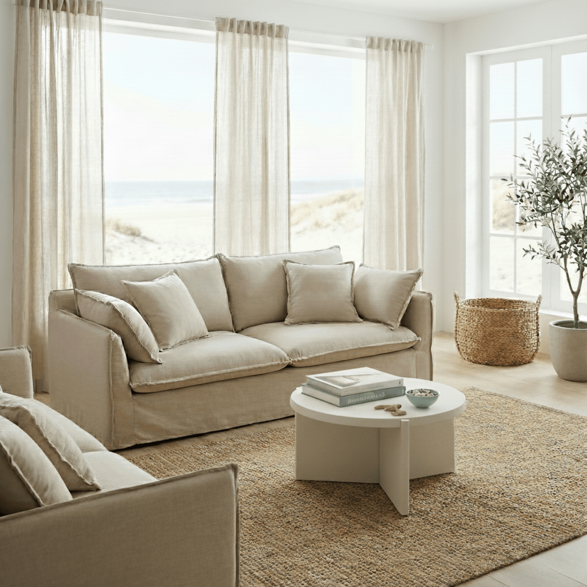 Introducing the Delos Sandstone Look Table Range, a remarkable fusion of modern style and coastal transitional charm. With its unique design in white, these tables effortlessly bring a touch of elegance and sophistication to any living space.