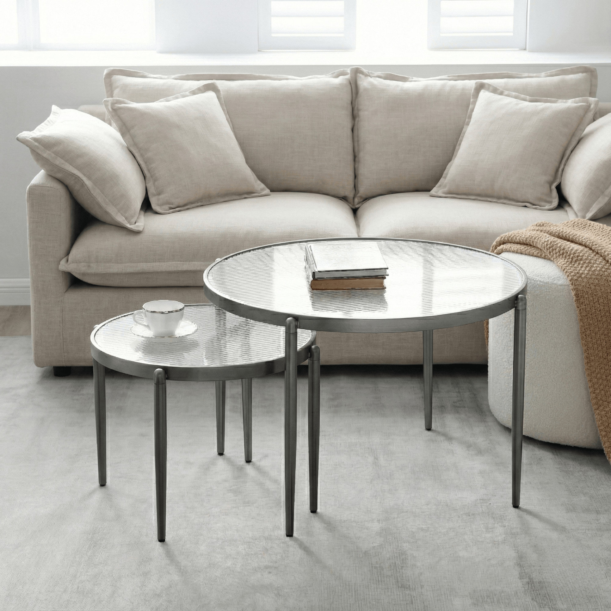Bring sophisticated luxury into your home with this Gatsby Set of 2 Coffee Table Nest. Crafted with fluted glass and brushed gunmetal grey steel, this modern set of tables will be a beautiful addition to any living space. Use the nest as two separate coffee and side tables or as a one-of-a-kind table nest centrepiece. Add elegance and style to any room with this unique, luxurious set.