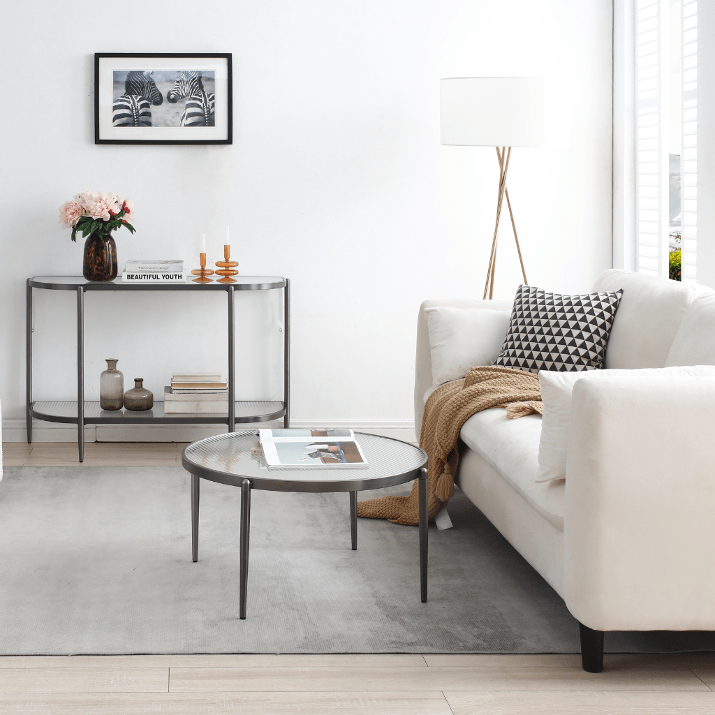 Discover the epitome of modern elegance with the Gatsby Round Glass Coffee Table in Brushed Gunmetal Grey. If you desire a coffee table that effortlessly enhances your living room, your search ends here. This exquisite piece showcases an on-trend fluted glass top gracefully supported by a chic charcoal frame and metal legs, exuding a timeless and sophisticated allure that seamlessly blends with any space.