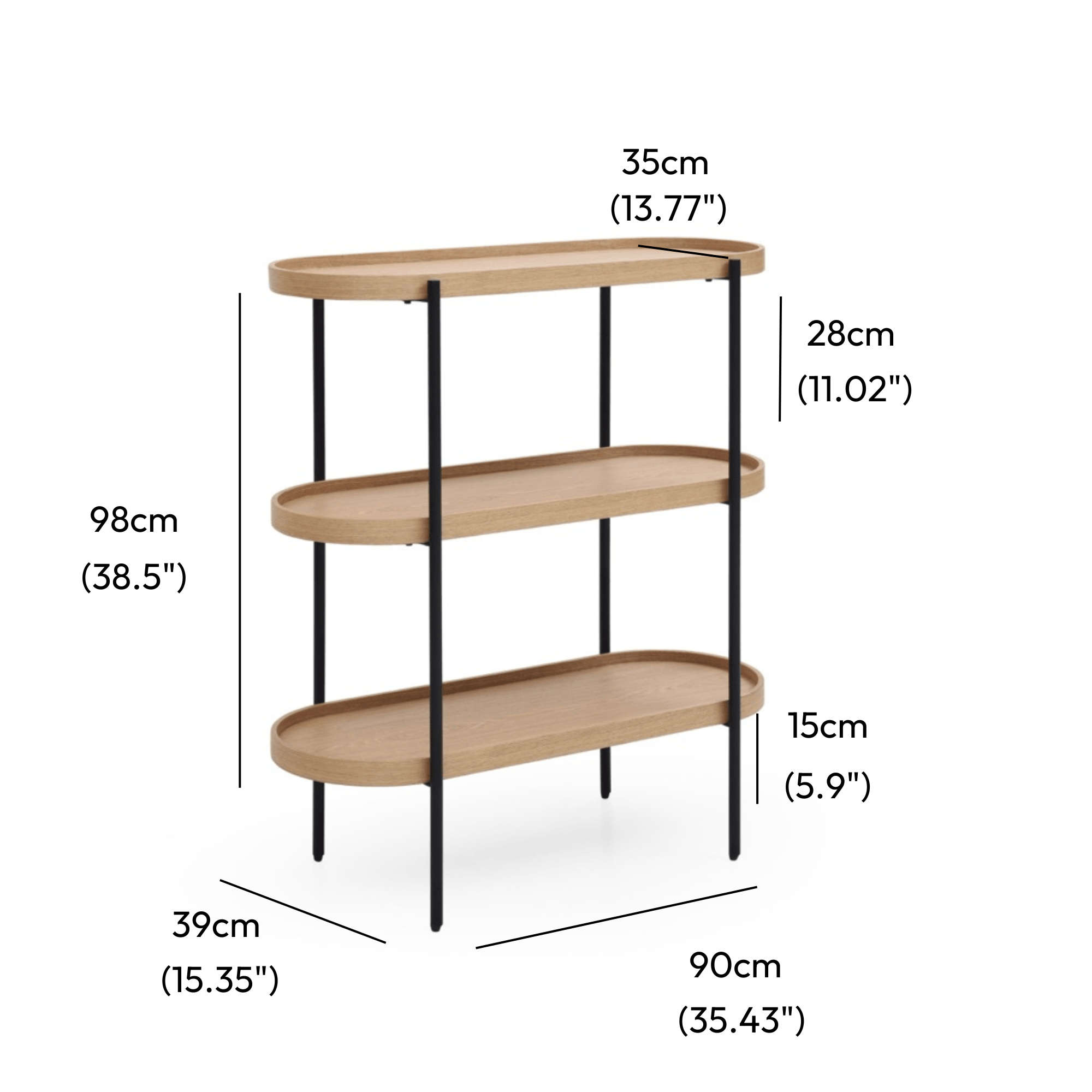 Each shelf is designed to comfortably hold up to 10kg, with a total maximum load of 30kg for the 3 tier bookcase and 50kg for 5 Tier. For best results, we recommend evenly distributing weight across the shelves and placing heavier items on the bottom to maintain stability.