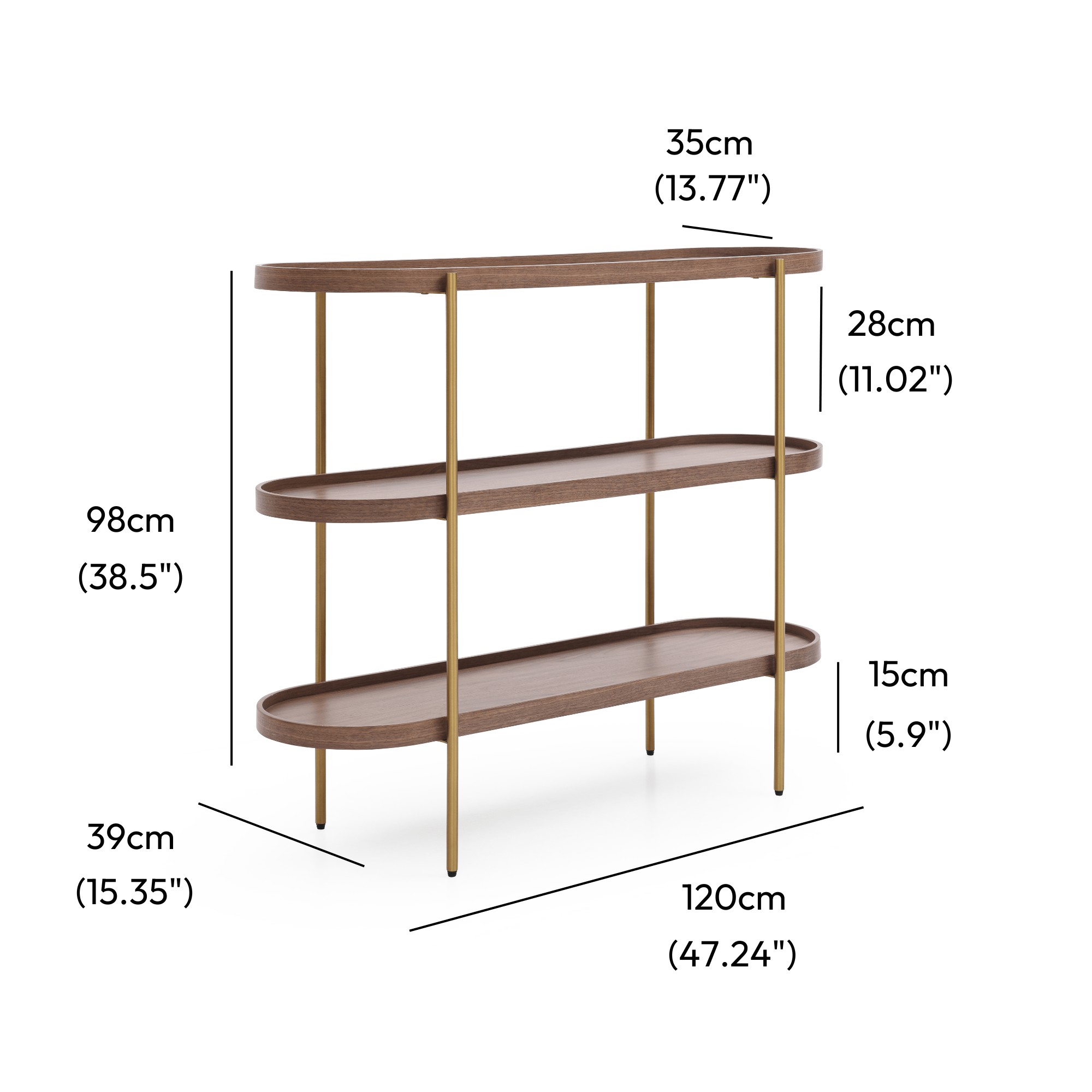 Cleo 3 Tier Wide Bookshelf/Console Walnut & Gold Frame