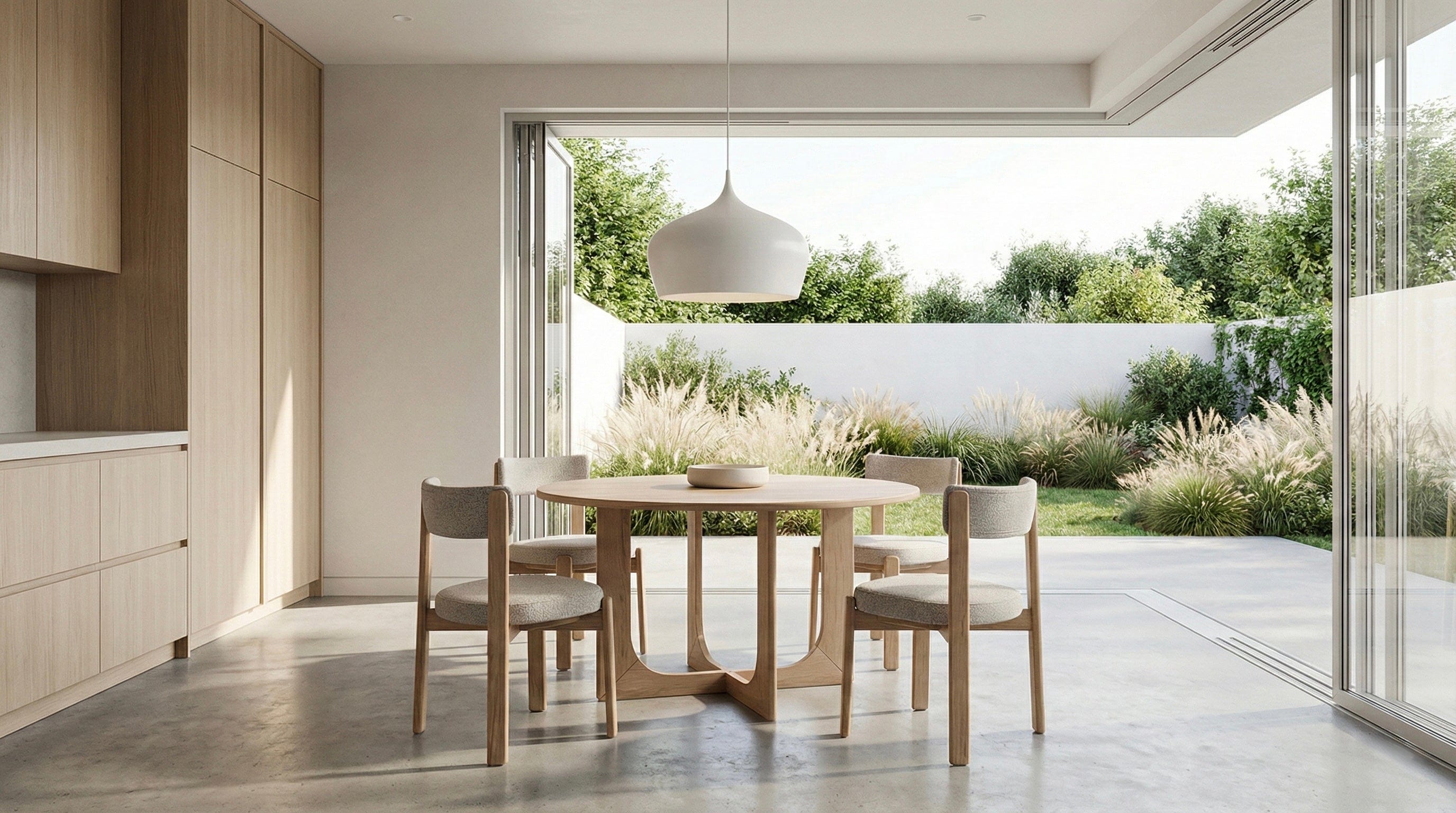 Round tables are seeing a revival for their ability to soften boxy rooms. The Oscar table brings "Soft Geometry" into the home, breaking up the straight lines of cabinetry, rugs, and walls. It is particularly effective in open-plan living/dining areas, where its curves guide the eye gently through the space rather than blocking it.