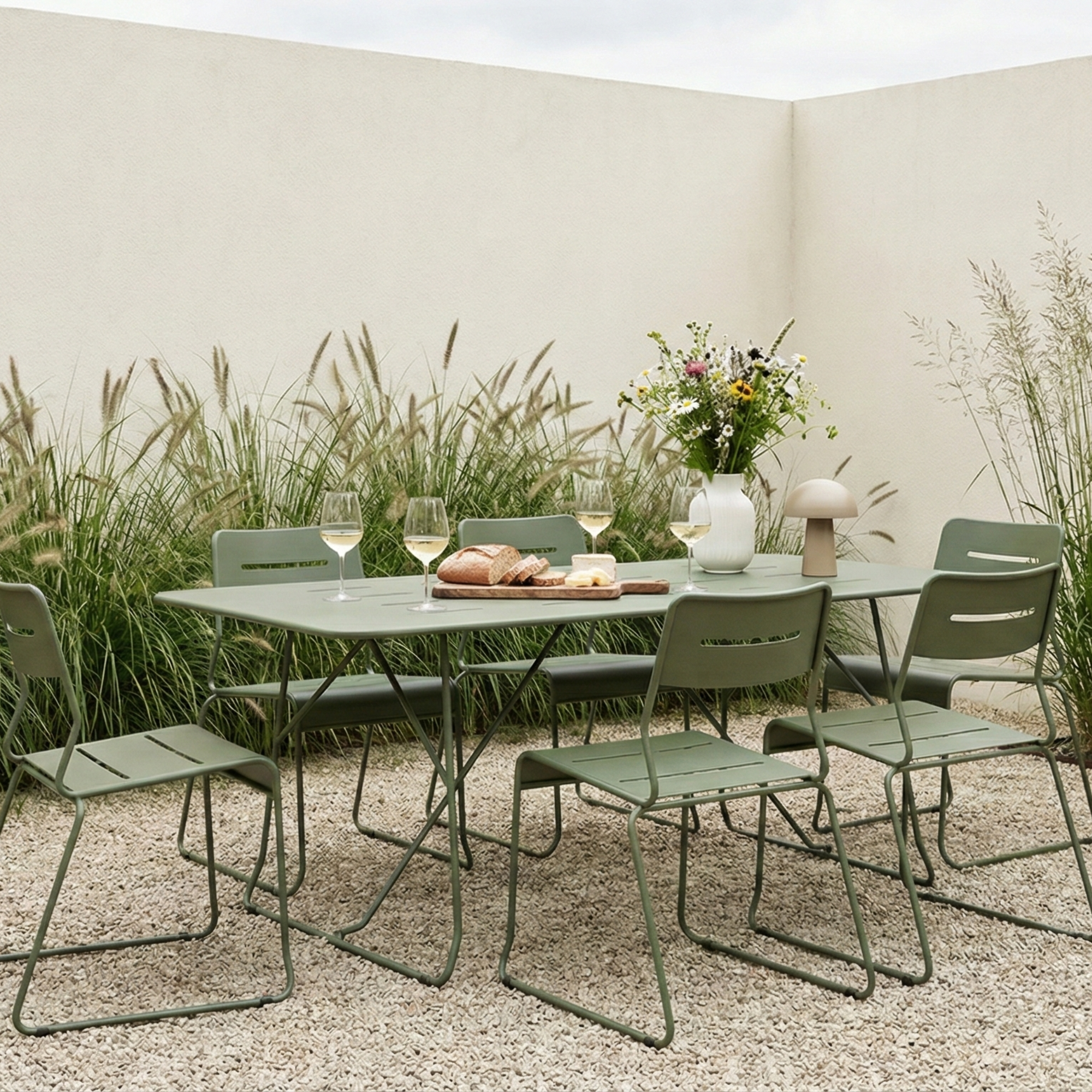 Host in style with the Parco Outdoor 7Pce Dining Table and Chairs in Olive. This grand setting is the centrepiece of any outdoor entertaining area, providing ample room for family and friends. It showcases the best of Exclusive Seek & Ramble designs, blending industrial strength with soft textures.