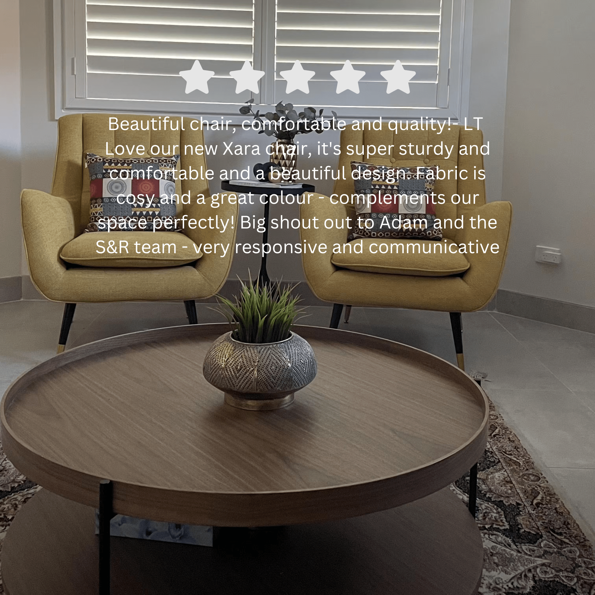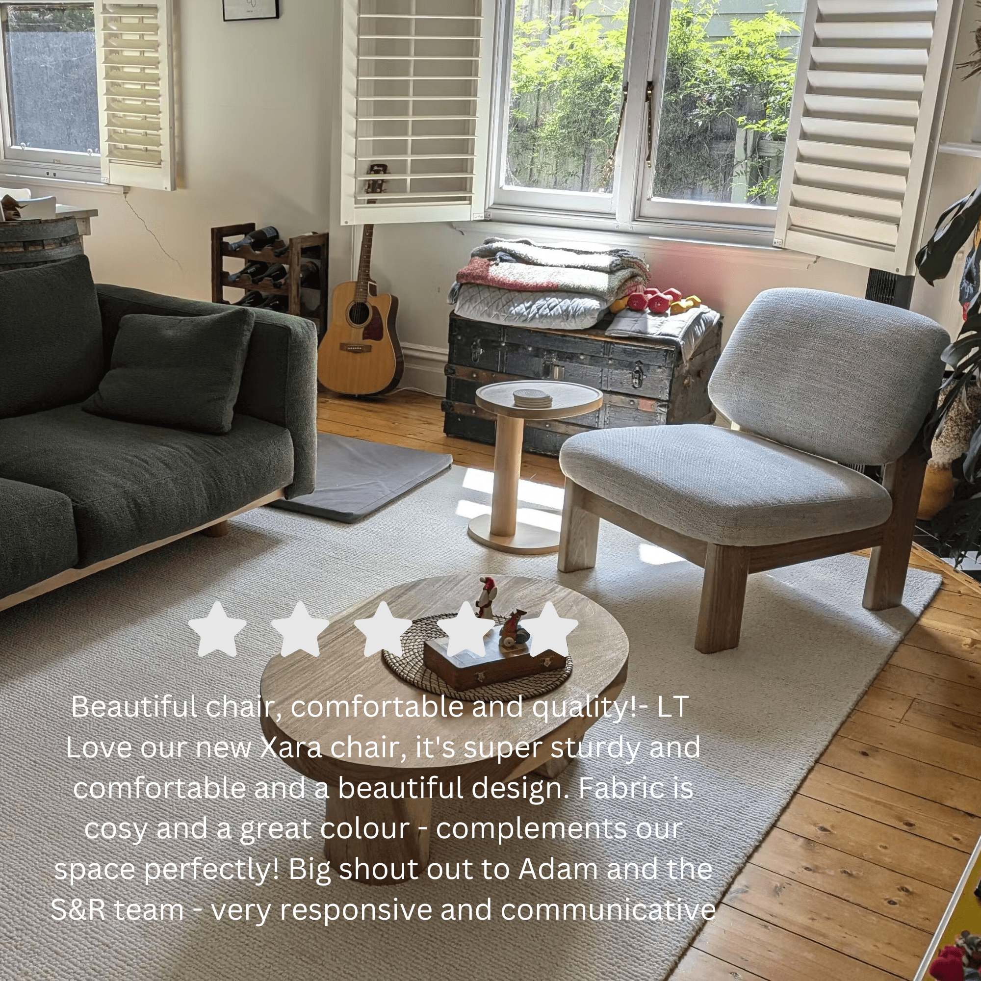 Love our new Xara chair, it's super sturdy and comfortable and a beautiful design. Fabric is cosy and a great colour - complements our space perfectly! Big shout out to Adam and the S&R team - very responsive and communicative
