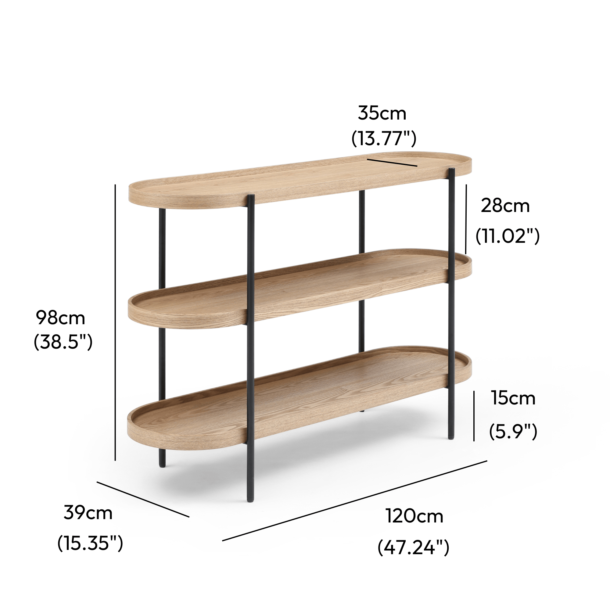 Each shelf is designed to comfortably hold up to 10kg, with a total maximum load of 30kg for the 3 tier bookcase and 50kg for 5 Tier. For best results, we recommend evenly distributing weight across the shelves and placing heavier items on the bottom to maintain stability.